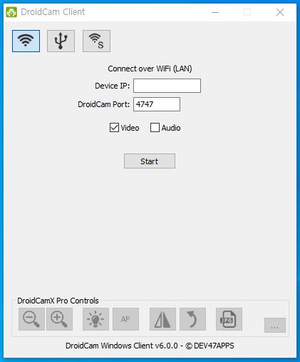 위에서 적어둔 ip주소를 컴퓨터에 설치한 "드로이드캠"프로그램의 Device IP란에 적어줍니다.