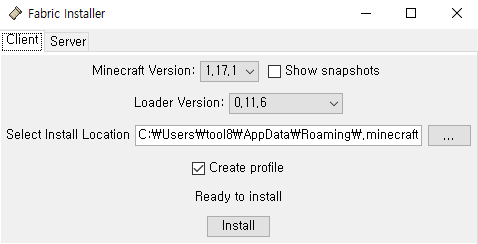 자신의 마인크래프트 게임 버전을 확인하고 동일하게 선택해서 Install을 눌러 설치를 진행한다.