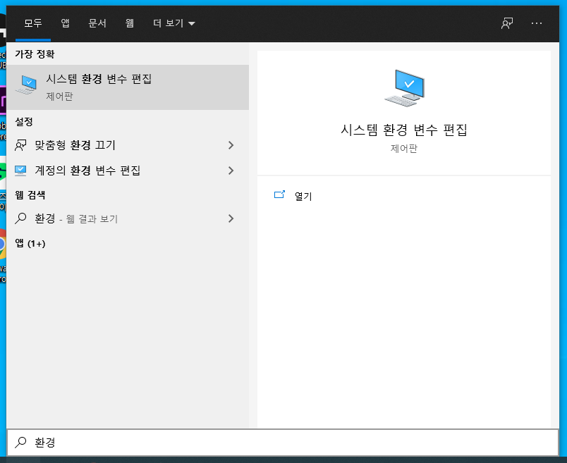 거기서 “환경” 이라고 검색하고 상단에 시스템 환경 변수 편집이라는 탭을 클릭!