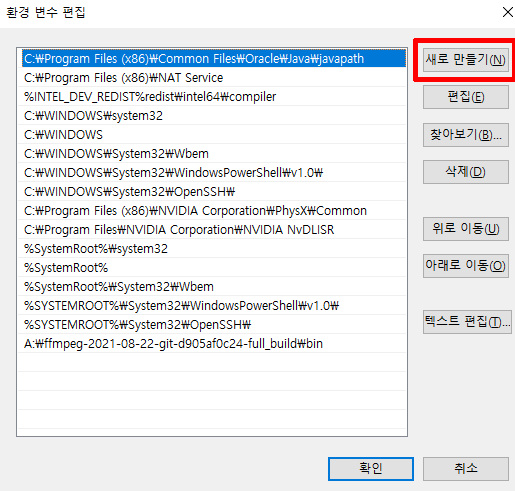 그곳에 아까 ffmpeg파일을 넣어두었던 경로를 적어주고 확인 클릭!
