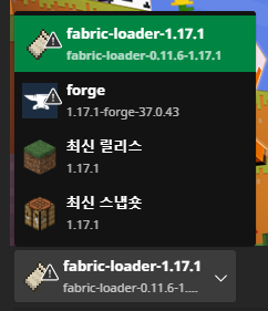 마인크래프트 왼쪽 하단에 보시면 fabric - loader 라는 탭이 새로 생겼을 겁니다.