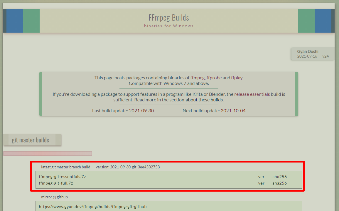 2. https://www.gyan.dev/ffmpeg/builds/ 에 들어가서 FFmpeg 를 다운받는다.