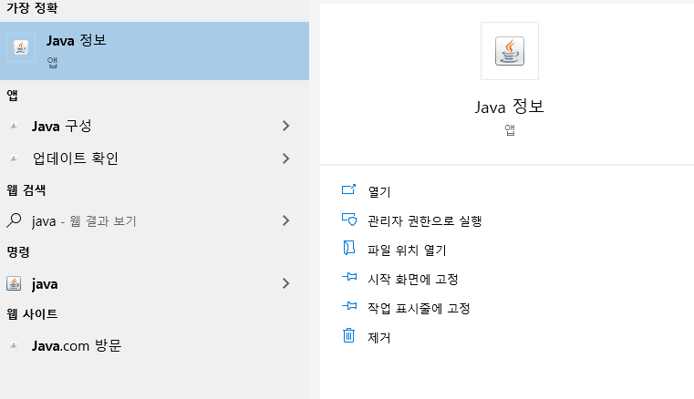 * 설치여부는 윈도우 검색에 Java라고 검색해보면 된다.