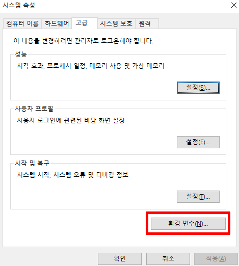 여기서 맨 하단에 환경변수(N)...을 클릭!