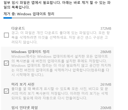 여기서 필요한 파일을 삭제하지 않고 용량을 확보할수 있는 공간은 표시된 임시파일에 해당하는 1.15GB 뿐입니다.