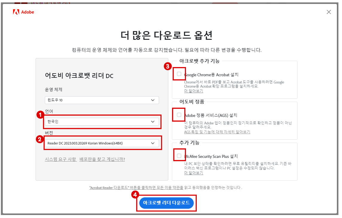 추가로 설치할 기능들 필요에 따라 ③체크 해제 하고 아크로벳 리더 다운로드 클릭!