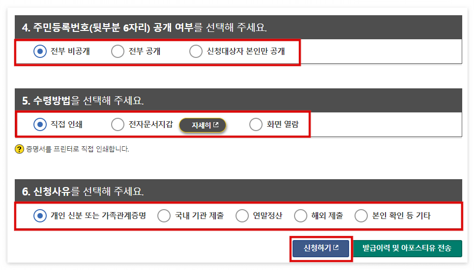 직접인쇄를 선택하고 신청하기 클릭하면 발급됩니다.