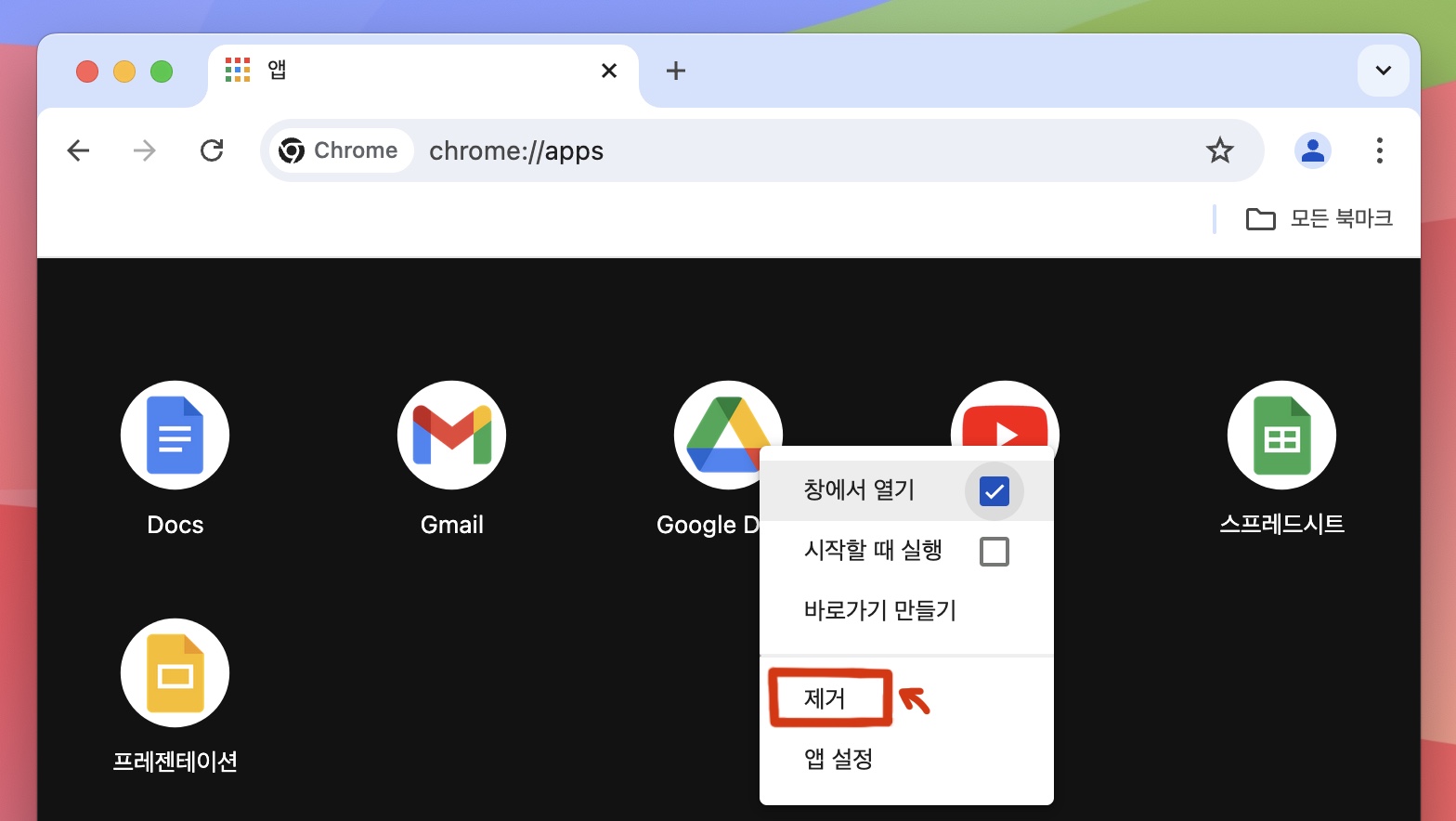 2) 구글창에 chrome://apps 에서 제거