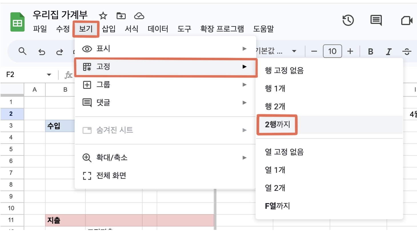 2. 상단 메뉴에서 보기 > 고정 > 0행까지 클릭